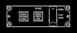 The GRND PROX FAIL indicator / switch illuminates when activated by an external warning signal from the GPW system. The WIND SHEAR INOP indicator / switch illuminates when activated by an external warning signal from the Wind Shear Warning system. The FLAP OVERRIDE toggle switch is covered by a red protective guard (in the NORM position) to prevent inadvertent inhibition of Mode 4 warnings.